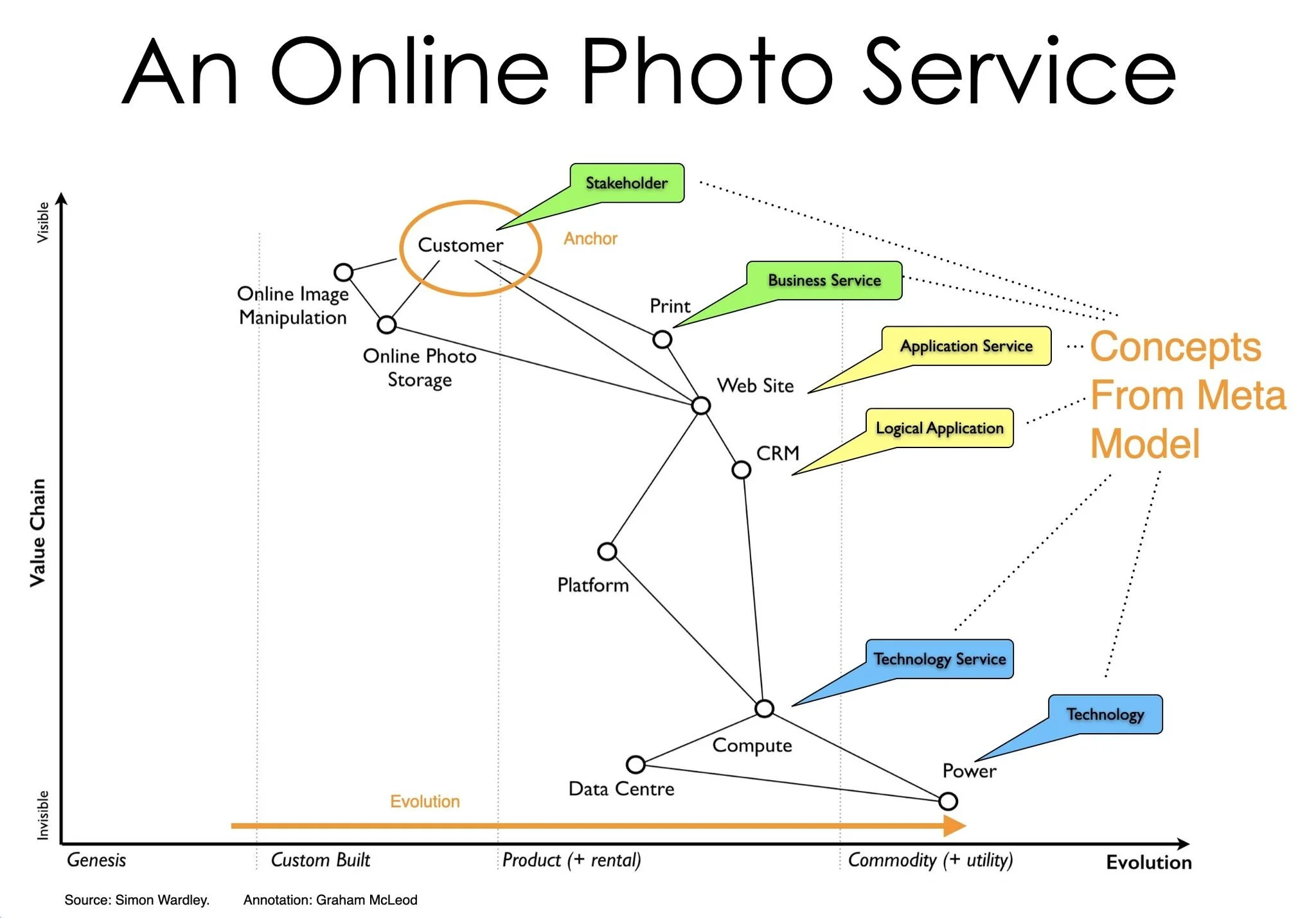 Maps can be thought of as similar to graphical models, but with axes that facilitate placing elements in spatial dimensions (specifically how close to the delivery of value / visibility to client they are (Y axis) VS how evolved they are in terms of how they are delivered (X axis). This means we can easily adapt existing graphical models and tools to also have axes and support maps